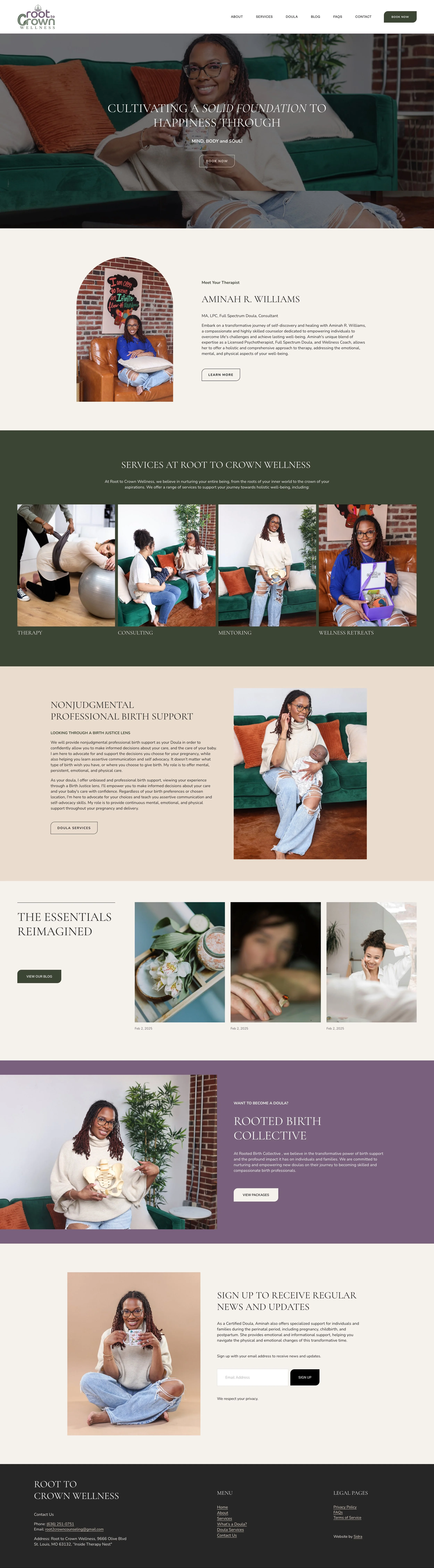 THE STORY: Root to Crown Wellness, founded by Aminah Williams, is a wellness and therapy practice offering holistic support alongside doula services. Aminah came to me for a full website redesign after her previous site failed to generate any inquiries or form submissions.