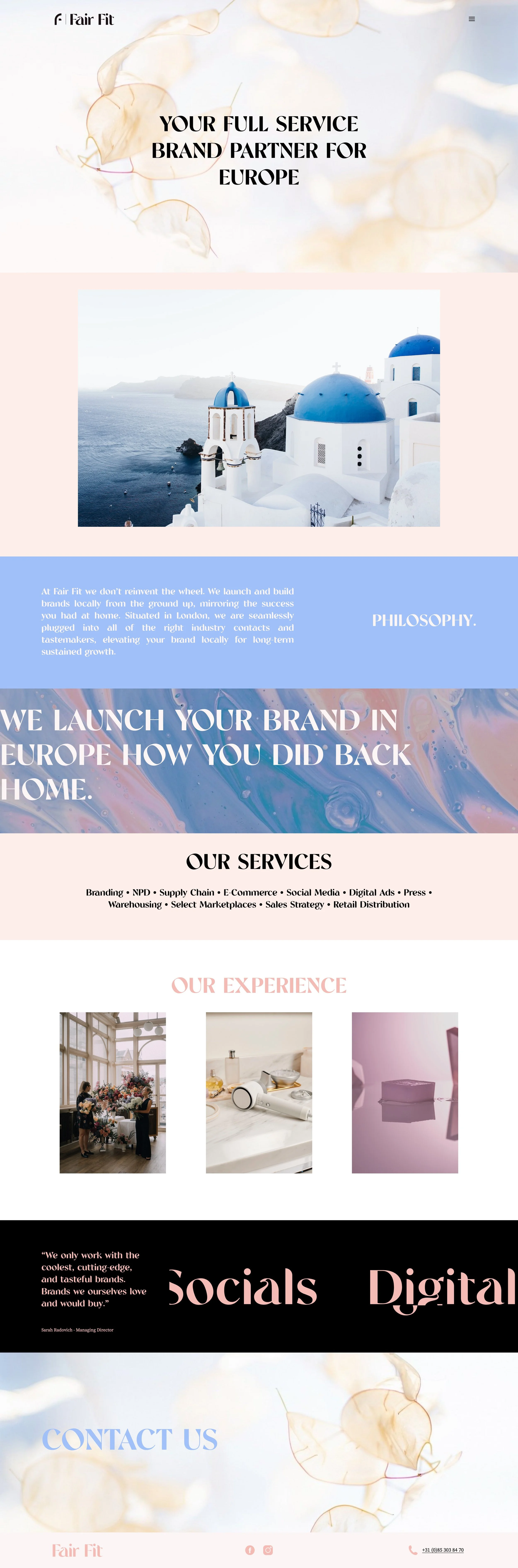 THE STORY: Fair Fit is a service brand partner that helps businesses launch their brands in Europe, replicating the success theyβve had back home. Sarah approached me for a new website that would reflect the brandβs identity online with an airy, flowy design that evokes the beauty and sophistication of Europe.